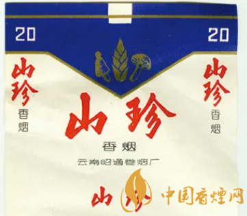 蘑菇是世界上食用菌中最大的一个菇种,因其富含的人体必需氨基酸、矿物质、维生素和多糖等营养成分,而有“植物肉”之称。上世纪80年代,云南昭通卷烟厂出品有一枚“山珍”(图5)烟标,该标主版上方于蓝底上,采用金色分别描绘了两种蘑菇,以及一根春笋的画面。
