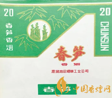 上世纪80年代恩施地区烟草公司出品过一枚“春笋”(图1)烟标,于绿意盎然的绿底上用金色勾绘出数片竹叶的中间,在金色的圆圈内则凸显出三根崭露头角的春笋。