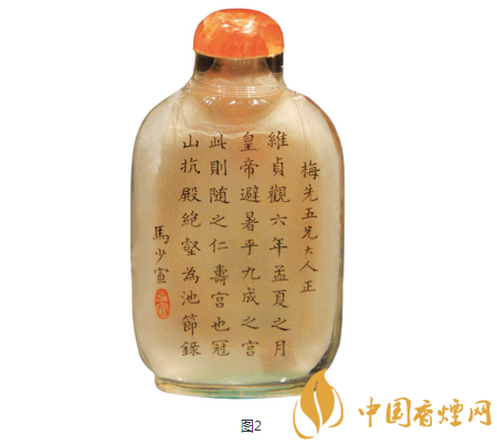笔者介绍的这件马少宣内画鼻烟壶,是四川博物院的一件藏品。其连盖高6.4、宽3.2厘米,直口,澄红玛瑙盖,圆颈溜肩,壶腹扁圆丰盈,椭圆形圈足,小口直挺。一面(图1)内画彩色字画残片,一面(图2)书《九成宫醴泉铭》部分内容:“梅先五兄大人正。维贞观六年孟夏之月,皇帝避暑乎九成之宫,此则隋之仁寿宫也。冠山抗殿,绝壑为池。节录。马少宣。”