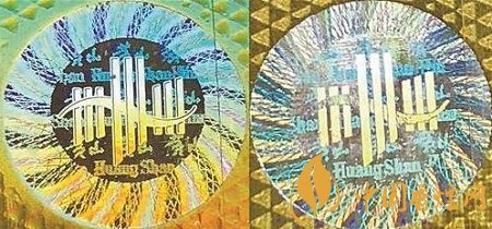 真品卷烟防伪标识采用激光全息防伪技术,不同角度呈现的图文线条清晰、立体感强。假冒卷烟防伪标识系伪造,变换角度呈现的图文线条模糊、立体感不强。(左真右假)