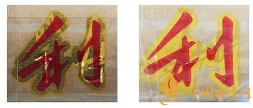 假冒卷烟:该款假冒卷烟激光全息防伪图案暗淡无光,图案无分层;两侧“三潭印月”都暗淡。上真下假