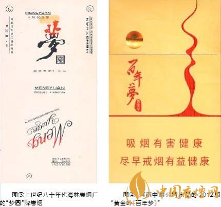 如新邵卷烟厂的“梦”(见图①),菏泽卷烟厂的“金梦”(见图②),贵定、海林卷烟厂的“梦圆”(见图③),兴义卷烟厂的“梦归”,许昌卷烟厂的“梦幻”,安阳、当阳卷烟厂的“蓝梦”,蓬安卷烟厂的“蓝的梦”,绵阳卷烟厂的“九寨沟梦幻”,阜阳卷烟厂的“东方梦”,铜仁卷烟厂的“梦中情”,太原卷烟厂的“梦佳丽”,红安卷烟厂的“梦之花”,四平卷烟厂的“梦妮”,凤凰卷烟厂乾州分厂“梦斯”等。另一类是取材于古代文学作品和传说。如南京卷烟厂的“梦都”,新晃卷烟厂的“红楼梦”,钟山卷烟厂的“梦”,广水卷烟厂的“黄粱梦”,长春卷烟厂的“梦仙草”,许昌卷烟厂的“梦蝶”等。