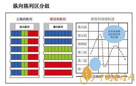 纵向陈列较横向陈列更符合顾客视线轨迹的运行,能最大限度地提升顾客对排面的关注,避免顾客视线死角的形成。如下图: