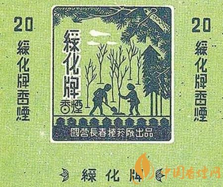 上世纪50年代,国营长春卷烟厂出品了“绿化牌”烟标。这枚烟标以绿色为底色,主版采用剪影的形式描绘了一幅植树图,画面上一个人扶着树苗,另外一个人挥锹培土,不远处是已经栽种好的一棵棵树苗,在树苗右上方,高大浓密的松树如母亲一般呵护着小树苗;副版上印着“大家植树 绿化祖国 护林防火 人人有责”的字样。
