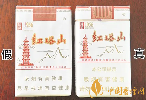 假烟采用胶印印刷,两种颜色交界边缘无锯齿痕迹,“1956”字体笔画粗细不均匀、无立体感且相对较细,红塔图案模糊。