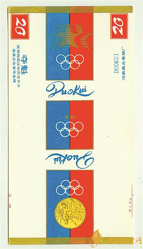1984年,在美国洛杉矶举行的第23届夏季奥运会上,我国射击运动员许海峰实现了我国奥运金牌零的突破。为祝贺我国运动员取得好成绩,上世纪80年代,河南商丘卷烟厂出品了多个版本的“夺魁”烟标。其中一个版本的“夺魁”烟标(图①),图案采用红色、蓝色和金色为主要配色,主版图案为洛杉矶奥运会会徽,左侧位置印有“祝贺我国运动员在廿三届奥运会首夺金牌”字样,副版上印有奥运会金牌图案和奥运五环标志。同时期,山东兖州卷烟厂出品了“五洲”烟标,主、副版图案分别为第23届夏季奥运会会徽和奥运五环标志。