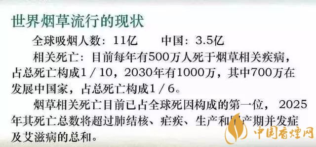 报告指出烟草消费在中国不仅造成大量人口过早死亡,从长远来看也将造成无法承受的经济代价:吸烟有关的疾病本世纪内在中国将一共造成2亿人死亡。