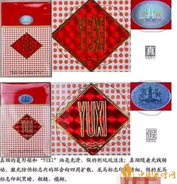 2.外包装上的“YUXI”标识,真的玉溪烟该标识从不同角度观察,呈现出不同的图形,且几何图形完整,边缘规则整齐;反之则为假烟。