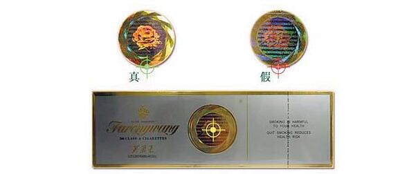 (2)看防伪标记:条盒的正面芙蓉花防伪标记,真烟的印刷在同一侧面看到的只有一个图样;假烟的印刷在同一侧面看到是几个在一起的图样。