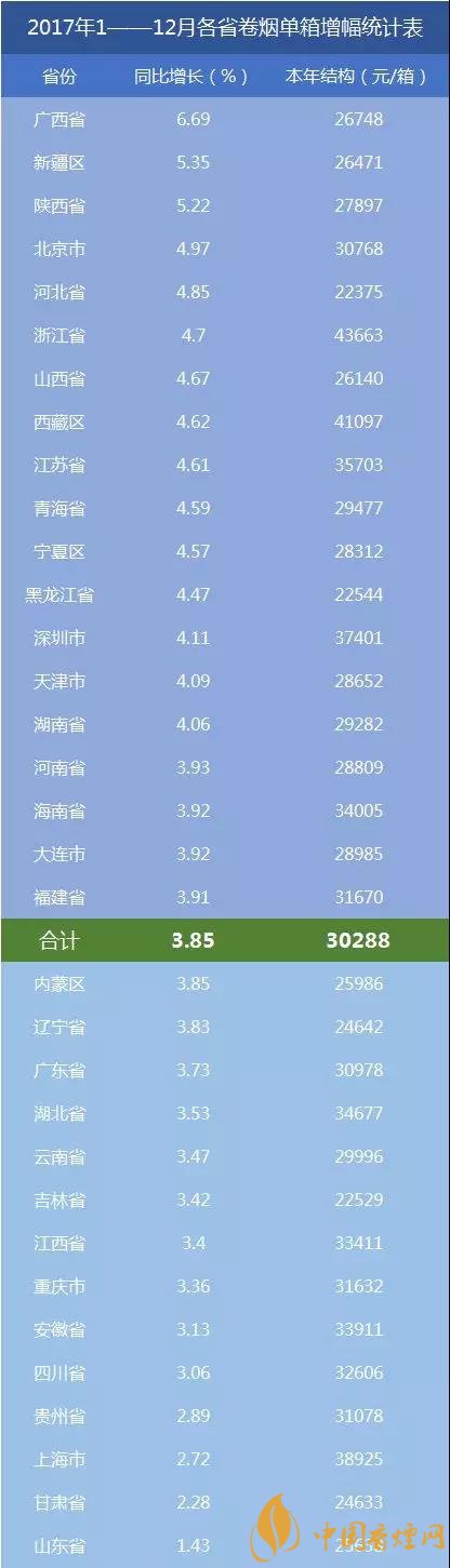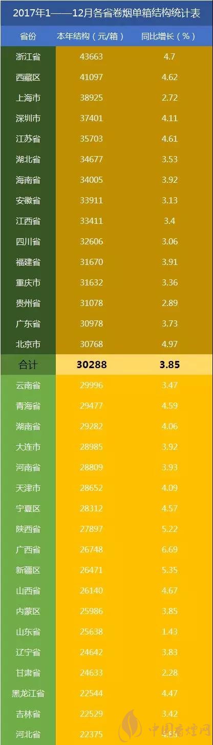 全国卷烟消费水平排名在今年的全国烟草大会上,凌局长在报告中在总结2017年卷烟发展水平时提到了,全年商业人销量增加10万箱以上的品牌有“黄鹤楼”“黄金叶”“泰山”“利群”“南京”“金圣”“黄山”等7个品牌,全国卷烟单箱批发均价均达到3.03万元,同比增加1122元。而在提到2018年的发展目标时又表示“今年卷烟单箱销售额提升目标是,卷烟消费保900元争1000元”。