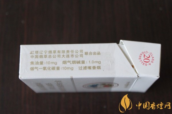 烟盒的右侧注明了理化数值,标注着由红塔辽宁烟草和在连公司联合出品,焦油量:10mg、烟气烟碱量:10mg、烟气一氧化碳量:10mg,三个10的理化数值,让人感觉它的协调性很好。