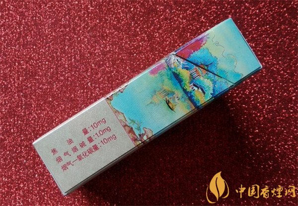 盒右侧标注着明确的理化值,1.0mg烟气烟碱量,10mg焦油量,10mg烟气一氧化碳量,上端印有梦幻般的江南风景图案,风格独特,特别的讨喜,以年轻人的审美观来看,非常有档次和个性,有一种独特的韵味。