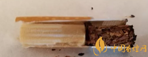 剖开欧免The King滤嘴,是经典的一段式醋酸纤维丝束滤嘴段。从丝束的颜色变化,很容易看到降焦孔开在了丝束的前1/3位置,颜色变化均匀。降焦孔后,每个孔位置,有条带状的颜色加深,是空气介入流动所致。从烟丝外观看,烟叶的品级非常好,用料实。摊开烟丝,看到的是明黄、棕黄的烤烟烟丝比例较大,间杂有比例稍小的深棕色的晾烟烟丝,未见涂布制丝和膨胀制丝。里面混杂与切成薄片状的烟梗。#p#副标题#e#