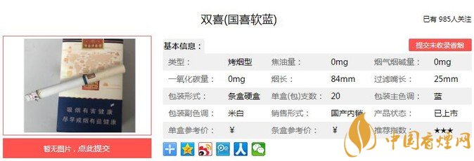 三、双喜国喜软蓝香烟参数双喜国喜软蓝烟支长84mm,过滤嘴长:25mm,因为这款是“非卖品”,所以全部为“0”的理化指标,当然这不可能是“0”焦油的,是厂家没有标注具体的理化指标而已。