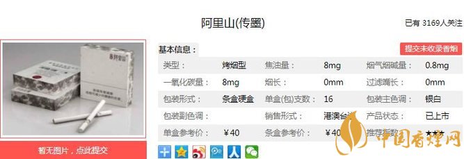 三、阿里山传墨香烟参数阿里山传墨烟支长84mm,过滤嘴长27mm,优秀配方式艺师配方,精选津巴布韦优质烟叶原料,手工选叶,自然醇化,烟气醇和饱满,烟香细腻丰富,吸味纯正,三香合一。下面我们一起来看阿里山传墨的参数信息:焦油量:8mg 烟碱量:0.8mg 一氧化碳量:8mg
