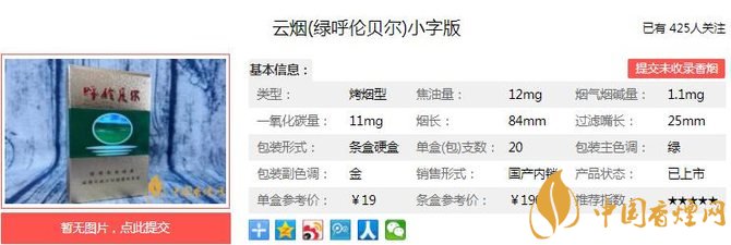 三、云烟绿呼伦贝尔小字版香烟参数