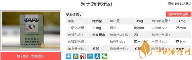 娇子宽窄好运烟支长:84mm,过滤嘴长:34mm,采用超微植物颗粒复合滤棒,提升烟草焦甜本味,更增独特复合香韵。下面我们一起来看娇子宽窄好运的参数信息:焦油量:10mg 烟碱量:1.1mg 一氧化碳量:11mg