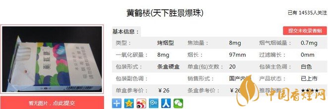 湖北中烟对这种极具中国特色爆珠味道的探索并没有停止,在他们全新爆珠产品——黄鹤楼(硬天下胜景)中,更是将极具中国风味特色的凤头姜提取物,作为爆珠添加的天然原料,以此形成的姜味爆珠,成为全国独创。经烟吧小编市场调查黄鹤楼天下胜景爆珠售价为26元/包。