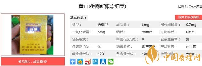 黄山徽商新概念细支是一款镂空烟嘴的细支卷烟,包装精美,侧翻盖设计也是一大亮点,堪比千元价位的‘细九五’。最重要的是,经典的“柔、绵、津、甜”之吸味,再加上名贵中药材之石斛爆珠的加持,能将‘黄山’品牌的焦甜香特色凸显得更胜一筹,每一位品吸过“徽商细支”的消费者都对之盛赞有加。经烟吧小编市场调查黄山徽商新概念细支售价为40元/包。