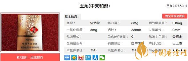 玉溪中支和谐是红塔集团高端突破的重点规格新品,产品传承中国传统文化理念,兼具中支和爆珠两种创新品类特质,使枇杷爆珠的果香与烟草本香相得益彰,吸味清香、甜润舒畅、平衡舒适。经烟吧小编市场调查玉溪中支和谐售价为45元/包。