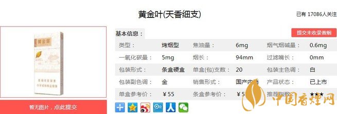 黄金叶天香细支烟支长:96mm,烤烟型,包装形式:硬盒(每盒 20 支,每条 10 盒),采用凹印印刷,墨层厚实鲜明纯正、层次清晰明显,套印准确,反面采用反面定位印刷。背面主图案为激光全息防伪定点烫,从不同角度能看到两层次内容,效果清晰。下面我们一起来看黄金叶天香细支的参数信息:焦油量:6mg 烟碱量:0.6mg 一氧化碳量:5mg