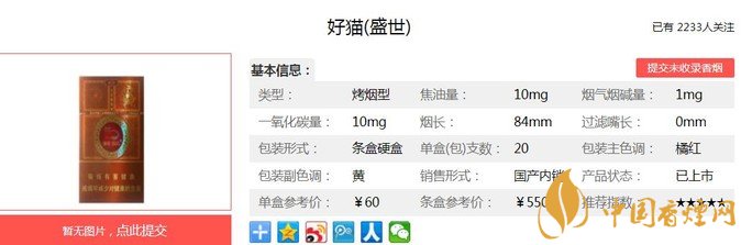 好猫盛世以高香低危害为主要设计方向,主要原料精心选用自然醇化两年以上的云南、津巴布韦烟叶,突出产品优雅的清香,烟香丰富谐调。在香料配方中首次采用具有生物减害技术的中草药“丰和液”,使有害气体得以转移降解,达到了“生津不起痰,回甜不口干”的良好效果。经烟吧小编市场调查好猫盛世售价为60元/包。