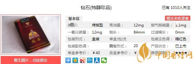 选用了以云南、贵州和福建等不同地区的上等烟叶作为主要原料,同时还辅以津巴布韦优质烟叶,生产中全部进行精心选叶。香料香精的选用国内高档香料,辅以进口香料,着重突出该产品的高档醇化烟香。烟香清雅、饱满、余味干净、舒适。经烟吧小编市场调查钻石特醇珍品售价为40元/包。