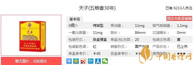 天子五粮香30年包装盒正中间是稻谷、小麦、玉米、高粱、大豆的图案,也就是所谓的内含五粮香珠的“五粮”,香烟吸味上纯粹五粮香,口感甘甜、味道醇厚,深受广大烟民的喜欢。经烟吧小编市场调查天子五粮香30年售价为40元/包。