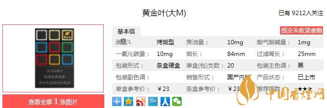 黄金叶大M烟支长84mm,过滤嘴长25mm,内部的烟支以7-6-7的规格排列,这时已经隐约能看到过滤嘴的颜色是不同的了,红橙黄绿青蓝紫多种颜色,下面我们一起来看黄金叶大M的参数信息:焦油量:10mg 烟碱量:1.0mg 一氧化碳量:10mg