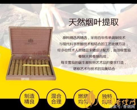 口感:全叶卷片烟纯手工雪茄;香气纯正、丰满,吸味顺爽。微微的辛辣感,以烟叶原味为主线,融合交错,劲头适中,味道均衡。不冲不淡,十分适合初尝雪茄的雪茄客。