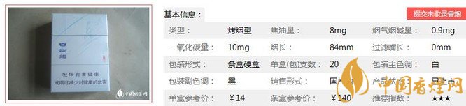白沙尚品白烟支长84mm,采用国际一流加工设备进行标准化加工,从烟叶生产到卷烟生产全过程进行化学成分分析,确保卷烟成品成分平衡。下面我们一起来看白沙尚品白的参数信息:焦油量:8mg 烟碱量:0.9mg 一氧化碳量:10mg