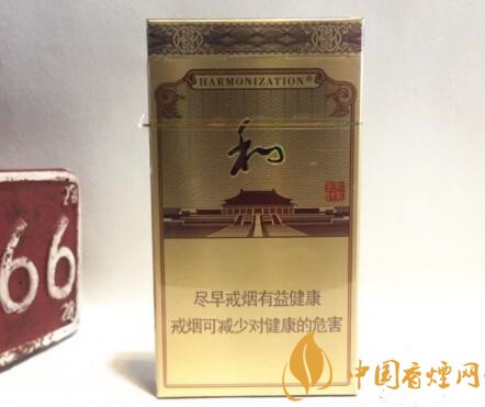 暗金黄的色调,正面有一个宫殿一样的图案,在图案上方有一个“和”字,右下角是一个红色印章:“和气生财”四个字。下面是警示标语。背面和正面是一样的设计,只是警语有些不同。整体包装传承了“和气生财”常规卷烟产品的主体特征,经过的精细调整与优化,更加优雅、大方,传达了“和气生财”高贵的品质和产品与众不同的“价值感”。
