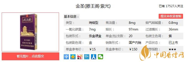 以上便是由烟吧小编为大家介绍的关于金圣滕王阁紫光好抽吗 金圣滕王阁紫光价格及口感分析的相关信息,想要了解更多有关内容请点击:白沙尚品蓝多少钱一包 白沙尚品蓝口感及参数介绍