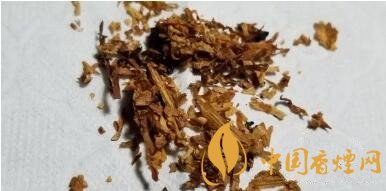 摊开烟丝,油润红亮,棕黄色自然陈化的烤烟原片丝占据80%的比例,间杂有切宽稍细的深棕色烟丝,烟梗则切得极薄,一般长度在6-7mm左右。用料比较厚道实在。