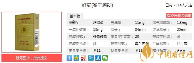 好猫牌香烟(猴王磨砂)”,简称“磨砂好猫”。产品的商标保持原猴王包装装潢用料和设计特色,配方设计保持“猴王(磨砂)”卷烟产品吸食自然、醇和、明快的香气特征和吸味风格。经烟吧小编市场调查好猫(猴王磨砂)售价为11元/包。