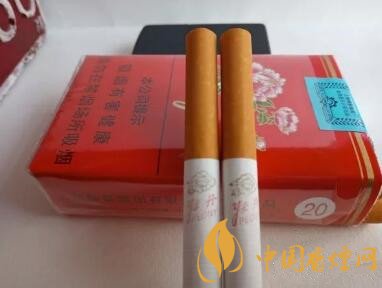 烟嘴颜色是黄色,上面隐约可以看到一些白色的小点,烟支上面印有牡丹的图案和logo。