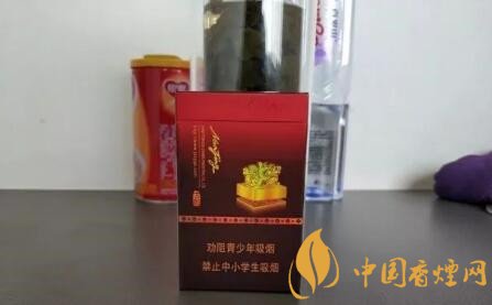 盒子的中间,一颗金黄色的玉玺,显示了它的尊贵的身份,玉玺图案的右边是一枚仿古的印章,内有“古都”两个字,在图案的下面是好像是一条镶着宝石的腰带。烟盒下面三分之一的面积,按照惯例还是警示语标识,警示语为本公司提示版,属于比较新的一款。