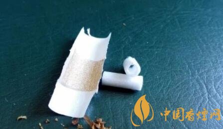 剪开镂空样式的过滤嘴,会发现有一层薄薄的黄色纸张,附着于过滤嘴纸张之上。镂空过滤嘴的长度,约为6mm。
