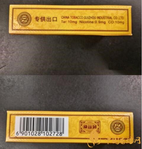 烟盒的两侧都有用到叶状的底纹装饰,左侧用中文标注了专供出口的身份,而贵烟公司名称和理化指标都用英文替代,焦油10mg/尼古丁0.9mg/一氧化碳10mg,数值不高不低。右侧则印着中文的国酒香品名和商品条码,扫码并未显示出口何地。