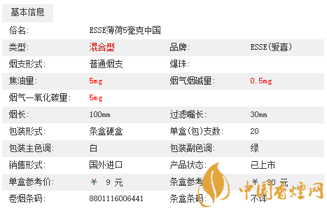 (注:08年四月份左右爱喜推出新款香烟,长度和粗度均和普通香烟一样,成分和口味均和和原来细长型爱喜并无分别。新款爱喜的烟盒和老款也有所区别,和上面的图有一点不一样,在新款爱喜弹劾“ESSE”的商标左面会多出“Menthol”的字样。)