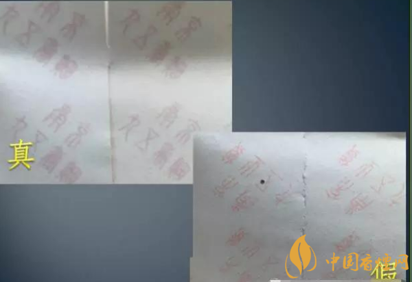 条盒底纹采用丝网印刷,墨层厚,触摸有明显的凹凸感,色泽亮丽。下图侧看真假对比效果。