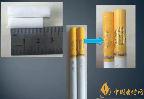 假冒卷烟:接装纸长度32mm,印刷效果不清晰,色泽暗淡,滤棒长度28mm。