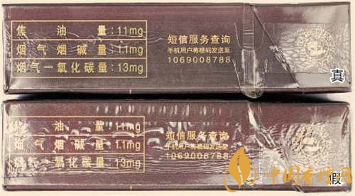 真烟商标纸采用复合镭射银卡纸,胶印和丝网印刷,“和天下”字体采用压凸烫金工艺,用手摸凹凸感较明显,且字体笔画较粗,商标纸上字体、拼音、花纹看上去有较清晰的竖线;假烟一般为高清扫描仿制印刷,“和天下”字体用手摸凹凸感不明显,且字体笔画较细,商标纸上拼音、花纹等处竖线较模糊。