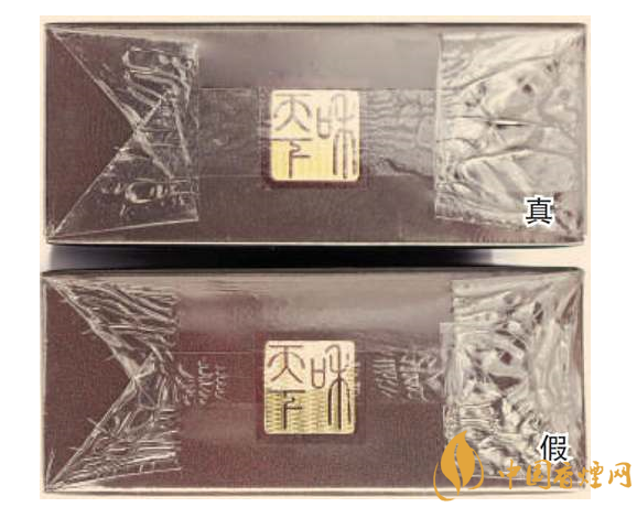 一、正面商标纸印刷工艺差异对比:真烟商标纸采用复合镭射银卡纸,胶印和丝网印刷,“和天下”字体采用压凸烫金工艺,用手摸凹凸感较明显,且字体笔画较粗,商标纸上字体、拼音、花纹看上去有较清晰的竖线;假烟一般为高清扫描仿制印刷,“和天下”字体用手摸凹凸感不明显,且字体笔画较细,商标纸上拼音、花纹等处竖线较模糊。