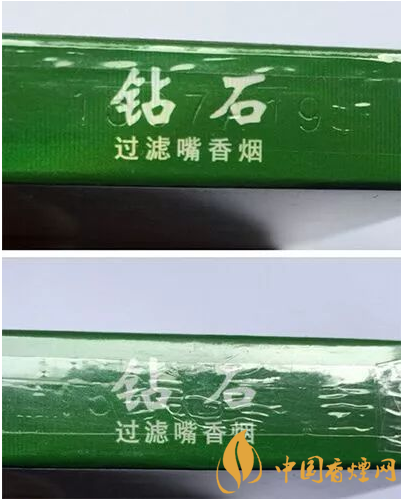 真品卷烟正面的“钻石”两字烫金光滑、平整,“荷花”两字的边缘为竖条纹状的白色印刷;