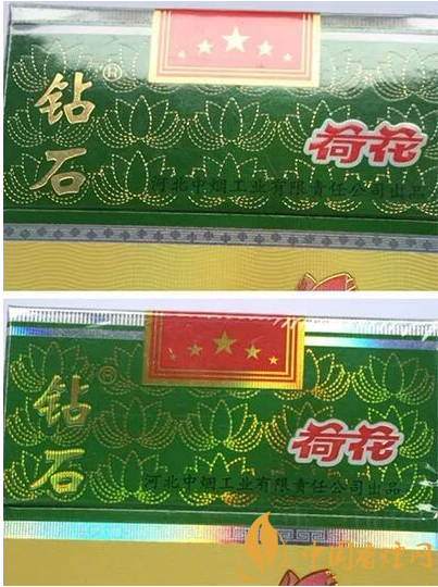 假烟正面的“钻石”两字的烫金呈竖条纹状,“荷花”两字的边缘为光滑的白色印刷。