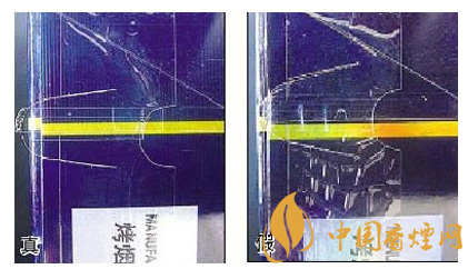 二看透明纸烫封:真品卷烟烫封平整,起皱均匀;假冒卷烟起皱不规则,皱纹多呈气泡状或网格状。