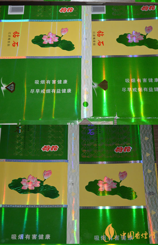 下面是对钻石(荷花)香烟的真假鉴别对比。图片左边为真,右边为高仿荷花,做的非常逼真。但是仔细看还是能看出来的。