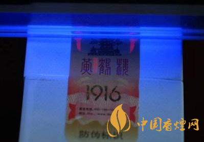 三、激光油墨。在紫外灯照射下,旧版防伪标贴只在“1916”左右出现两只金黄色飞翔的鹤;新版防伪标贴还会在黄鹤楼城楼图案的左右呈现两只粉红色的飞翔的鹤,另外在“黄鹤楼”的“黄”字右边呈现一粉红色的长条块。