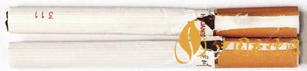 烟支过滤嘴及烟丝差异对比:真品烟支采用单一醋纤滤嘴,长度为25mm,烟丝切丝宽度均匀,烟丝疏松、光泽油润性好、含碎末少。烟丝结构为叶丝、膨胀叶丝、膨胀梗丝和再造烟叶;假烟烟支过滤嘴较短,长度约为21mm,制丝工艺粗糙,光泽油润性差、烟丝中含碎末较多,大量梗丝未经过膨胀处理,一般无膨胀叶丝和再造烟叶,与真品特征存在明显差异。